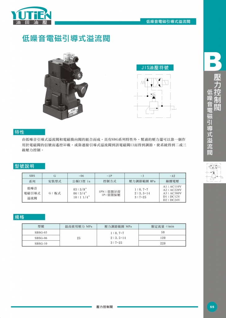 YUTIEN低噪音電磁引導(dǎo)式溢流閥部分常規(guī)型號(hào)參考:SBSG-03-1P-1-A1 , SBSG-03-1P-1-A2 , SBSG-03-1P-1-A3 , SBSG-03-1P-1-D1 , SBSG-03-1P-1-D2 , SBSG-03-1P-2-A1 , SBSG-03-1P-2-A2 , SBSG-03-1P-2-A3 , SBSG-03-1P-2-D1 , SBSG-03-1P-2-D2 , SBSG-03-1P-3-A1 , SBSG-03-1P-3-A2 , SBSG-03-1P-3-A3 , SBSG-03-1P-3-D1 , SBSG-03-1P-3-D2 , SBSG-03-1PN-1-A1 , SBSG-03-1PN-1-A2 , SBSG-03-1PN-1-A3 , SBSG-03-1PN-1-D1 , SBSG-03-1PN-1-D2 , SBSG-03-1PN-2-A1 , SBSG-03-1PN-2-A2 , SBSG-03-1PN-2-A3 , SBSG-03-1PN-2-D1 , SBSG-03-1PN-2-D2 , SBSG-03-1PN-3-A1 , SBSG-03-1PN-3-A2 , SBSG-03-1PN-3-A3 , SBSG-03-1PN-3-D1 , SBSG-03-1PN-3-D2 , SBSG-06-1P-1-A1 , SBSG-06-1P-1-A2 , SBSG-06-1P-1-A3 , SBSG-06-1P-1-D1 , SBSG-06-1P-1-D2 , SBSG-06-1P-2-A1 , SBSG-06-1P-2-A2 , SBSG-06-1P-2-A3 , SBSG-06-1P-2-D1 , SBSG-06-1P-2-D2 , SBSG-06-1P-3-A1 , SBSG-06-1P-3-A2 , SBSG-06-1P-3-A3 , SBSG-06-1P-3-D1 , SBSG-06-1P-3-D2 , SBSG-06-1PN-1-A1 , SBSG-06-1PN-1-A2 , SBSG-06-1PN-1-A3 , SBSG-06-1PN-1-D1 , SBSG-06-1PN-1-D2 , SBSG-06-1PN-2-A1 , SBSG-06-1PN-2-A2 , SBSG-06-1PN-2-A3 , SBSG-06-1PN-2-D1 , SBSG-06-1PN-2-D2 , SBSG-06-1PN-3-A1 , SBSG-06-1PN-3-A2 , SBSG-06-1PN-3-A3 , SBSG-06-1PN-3-D1 , SBSG-06-1PN-3-D2 , SBSG-10-1P-1-A1 , SBSG-10-1P-1-A2 , SBSG-10-1P-1-A3 , SBSG-10-1P-1-D1 , SBSG-10-1P-1-D2 , SBSG-10-1P-2-A1 , SBSG-10-1P-2-A2 , SBSG-10-1P-2-A3 , SBSG-10-1P-2-D1 , SBSG-10-1P-2-D2 , SBSG-10-1P-3-A1 , SBSG-10-1P-3-A2 , SBSG-10-1P-3-A3 , SBSG-10-1P-3-D1 , SBSG-10-1P-3-D2 , SBSG-10-1PN-1-A1 , SBSG-10-1PN-1-A2 , SBSG-10-1PN-1-A3 , SBSG-10-1PN-1-D1 , SBSG-10-1PN-1-D2 , SBSG-10-1PN-2-A1 , SBSG-10-1PN-2-A2 , SBSG-10-1PN-2-A3 , SBSG-10-1PN-2-D1 , SBSG-10-1PN-2-D2 , SBSG-10-1PN-3-A1 , SBSG-10-1PN-3-A2 , SBSG-10-1PN-3-A3 , SBSG-10-1PN-3-D1 , SBSG-10-1PN-3-D2