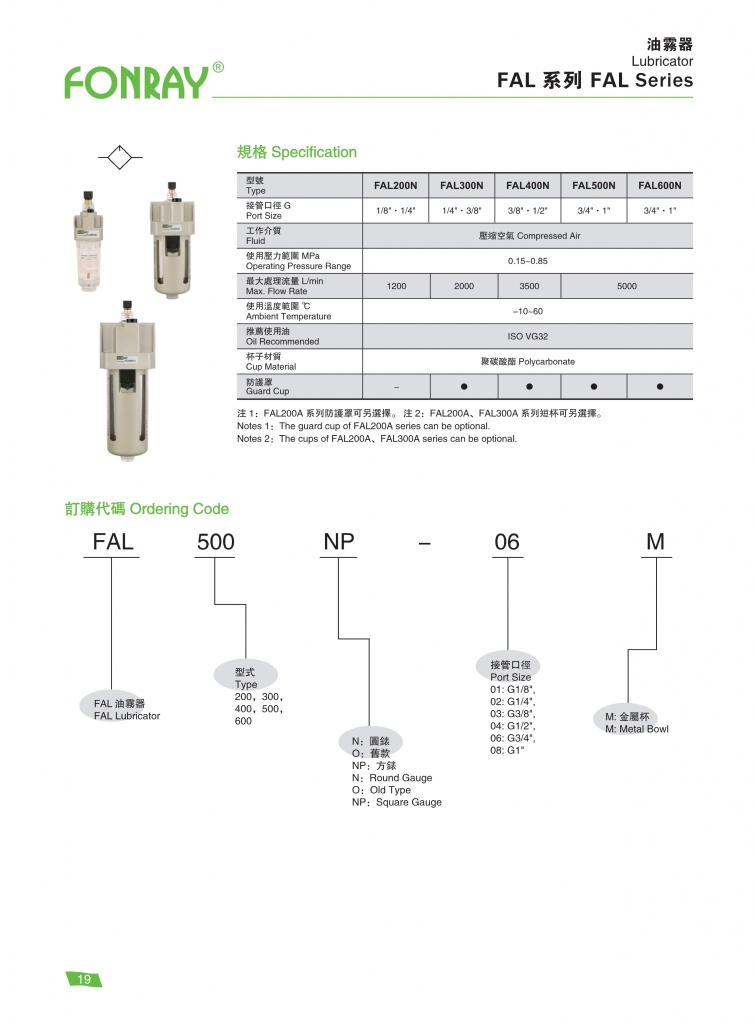 油霧器 – FAL 型號(hào) 接管口徑 (G/PT) 最大流量 (L/min) 使用壓力範(fàn)圍 (Mpa) FAL200N-01 、 02 1/8 ″ 、 1/4 ″ 1200 0.15 ~ 0.85 FAL300N-02 、 03 1/4 ″、 3/8 ″ 2000 FAL400N-03 、 04 3/8 ″、 1/2 ″ 3500 FAL500N-06 、 08 3/4 ″、 1 ″ 5